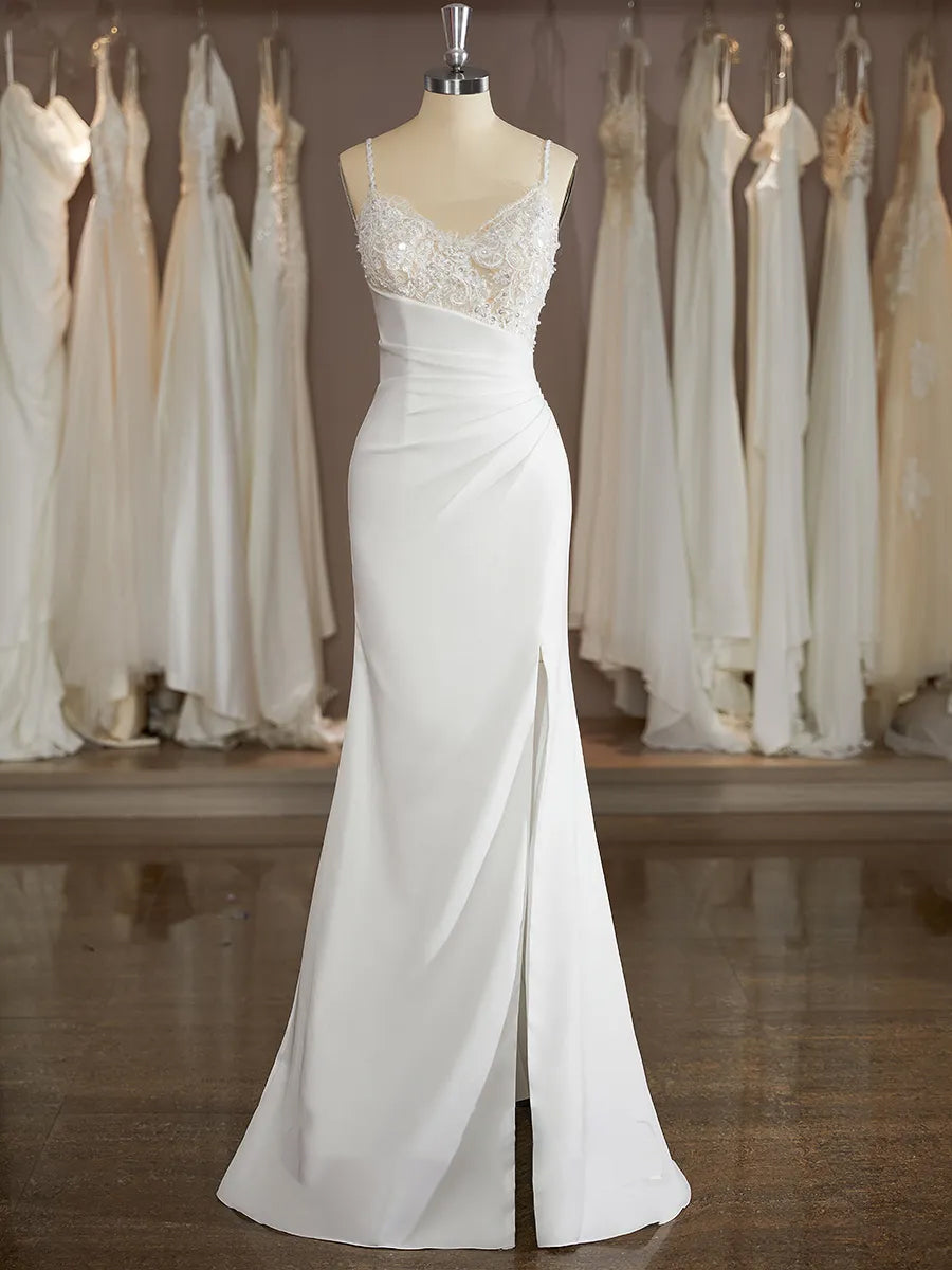 Sofisticación pura y silueta estilizada definen a Élan, un vestido de novia elegante y contemporáneo para la novia moderna que valora la delicadeza en cada detalle. Su corset con finos tirantes y escote corazón está adornado con apliques florales y bordados brillantes que aportan textura y un toque romántico. La falda con sutil drapeado hacia el lado y cola con suave caída estiliza la figura, mientras que una abertura lateral añade un sutil aire seductor. La espalda con botones forrados que descienden hasta la cola proporciona un cierre clásico y refinado. Perfecto para bodas minimalistas, civiles o de destino.