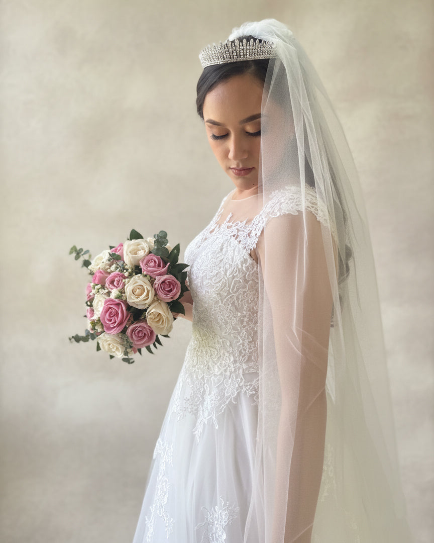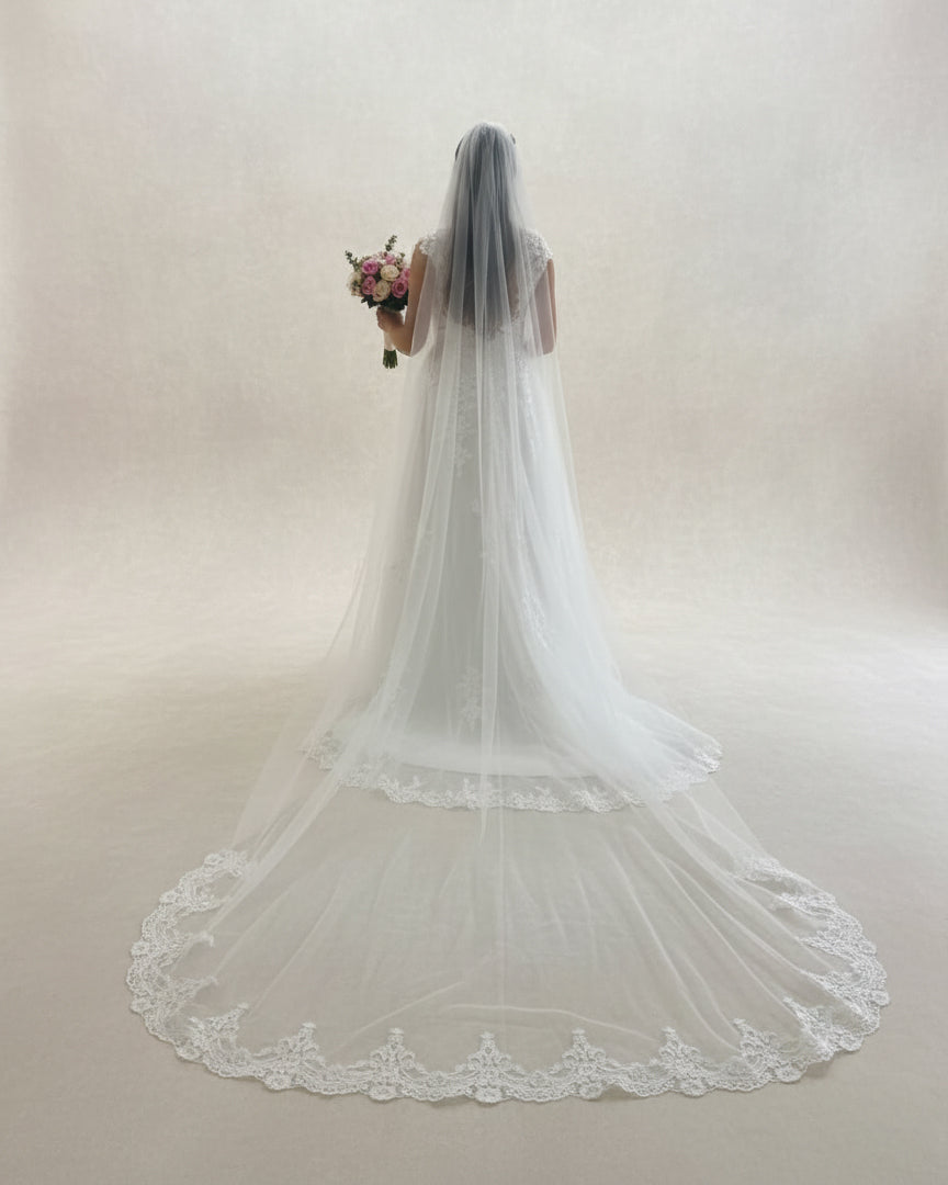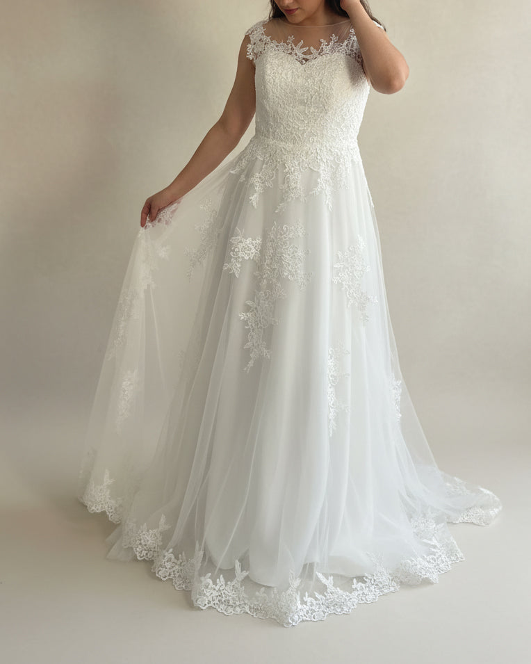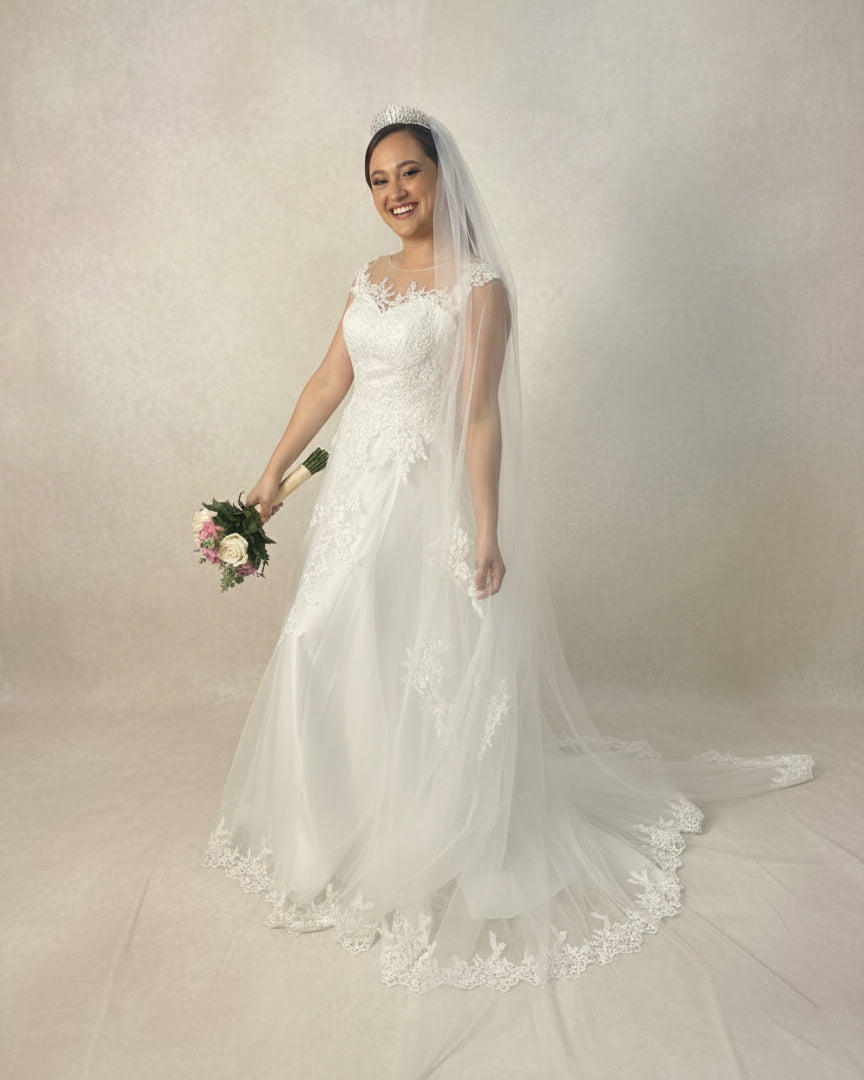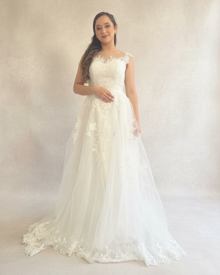 Un vestido corte sirena con delicados apliques florales en encaje que se funden con la silueta. Su escote ilusión con efecto tatuaje y espalda trabajada en transparencias añaden un aire romántico y sofisticado. El diseño realza las curvas con elegancia y culmina en una suave cola que aporta majestuosidad sin exceso.