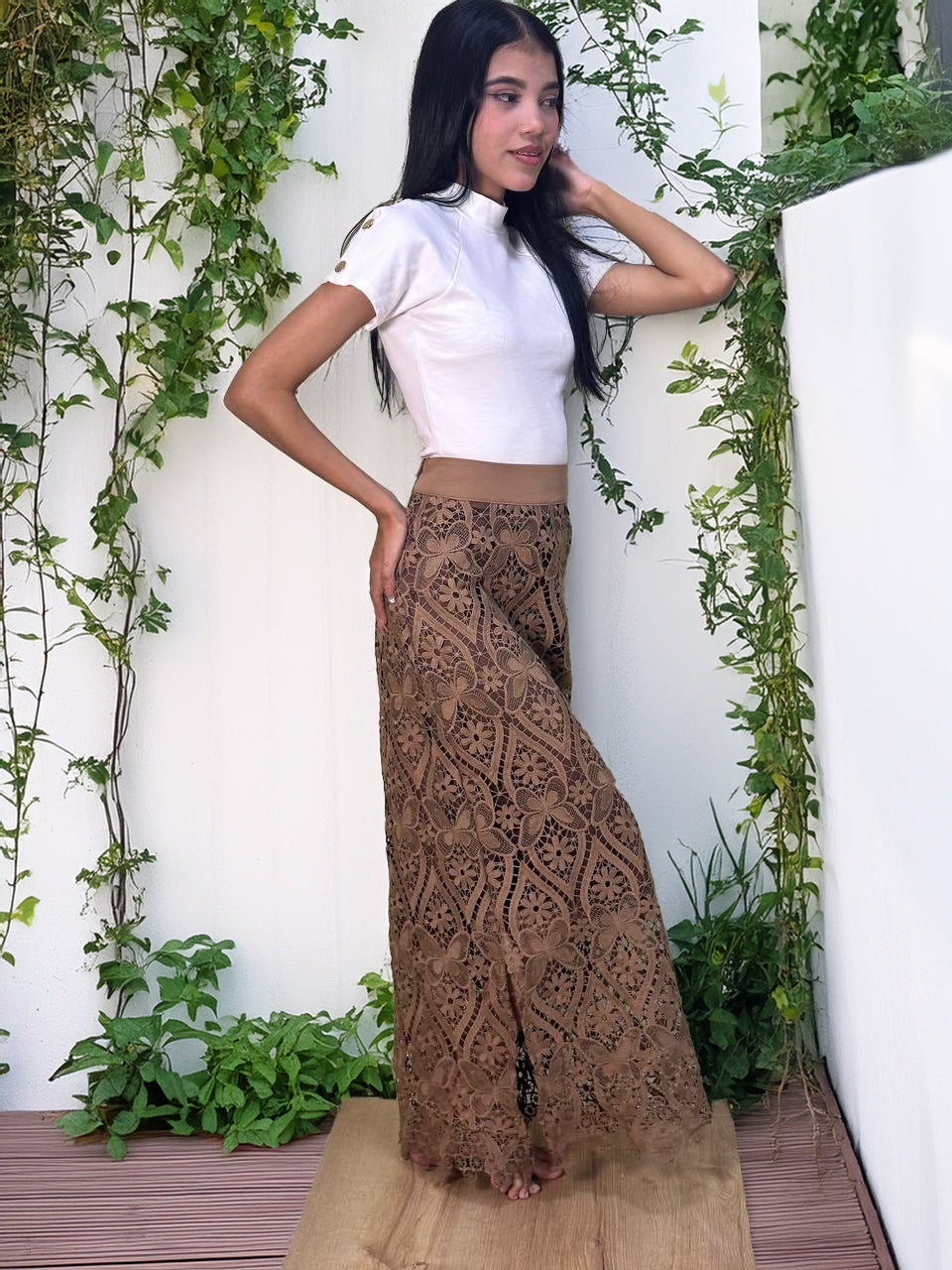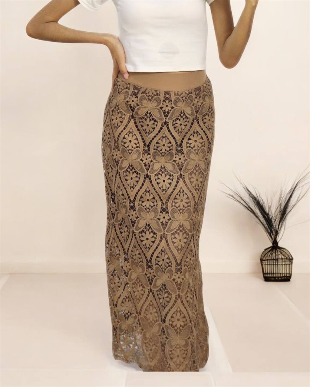 Elegante y sofisticada, esta falda larga está confeccionada en delicado guipur, un tejido de encaje con textura y diseño único que realza la feminidad en cada detalle. Su patrón floral en tono tierra aporta un estilo clásico pero moderno, ideal para destacar en cualquier ocasión.