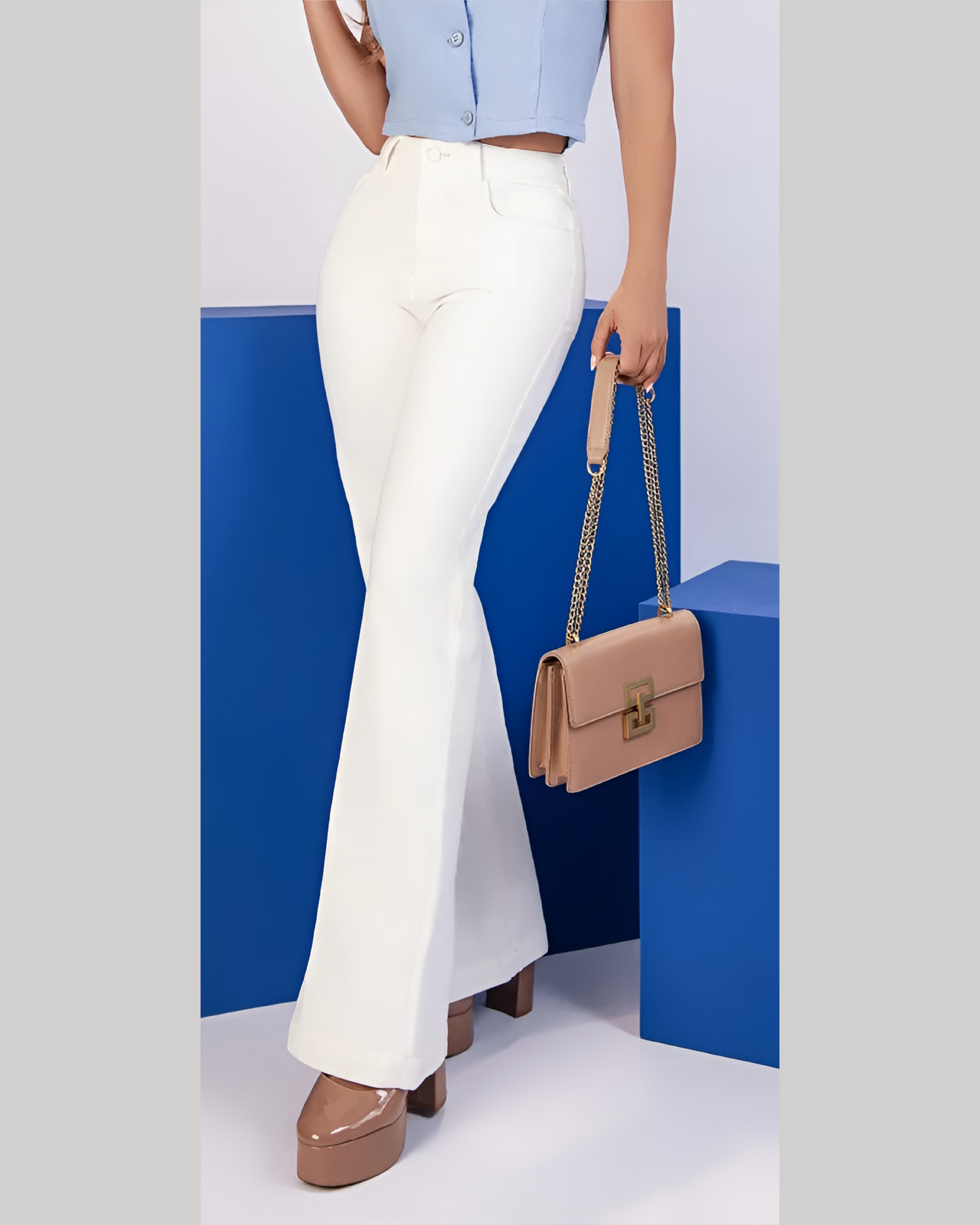 Un clásico renovado que estiliza tu figura. Este jean blanco de bota semicampana realza la silueta gracias a su tiro alto y corte ajustado en cadera y muslos, abriéndose ligeramente en la parte inferior para aportar un toque elegante y moderno. Perfecto para looks casuales chic o para combinar con blusas y tacones en ocasiones especiales.