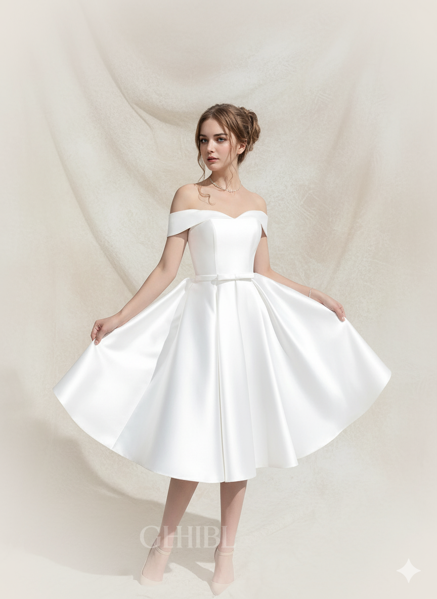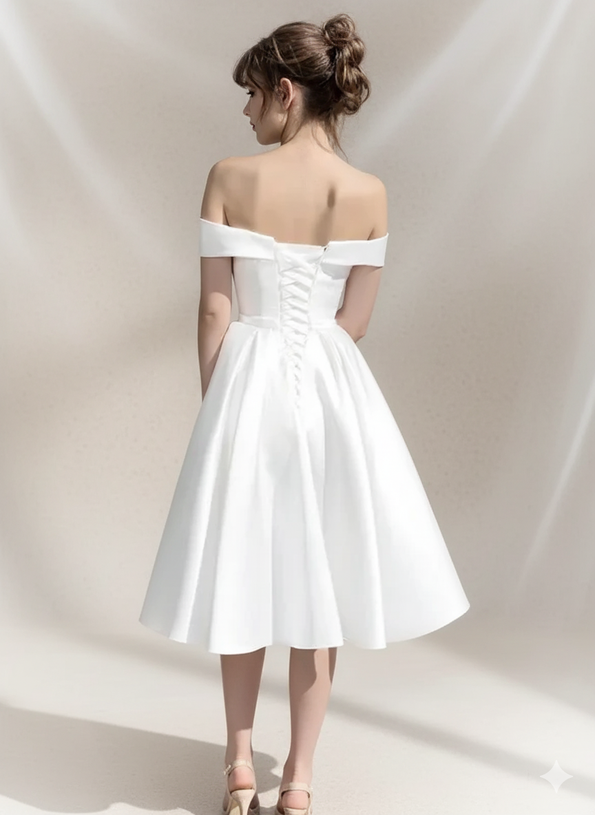 Fresco, moderno y encantador. Lana es un vestido corto estilo cóctel con escote off-shoulder que resalta los hombros con elegancia. Confeccionado en satén liso de caída estructurada y falda en línea A con vuelo, es la opción perfecta para una novia que desea sentirse cómoda y sofisticada, ya sea en su boda civil o como cambio para la recepción. Su diseño minimalista y juvenil lo convierte en una apuesta segura para una celebración moderna y con estilo.