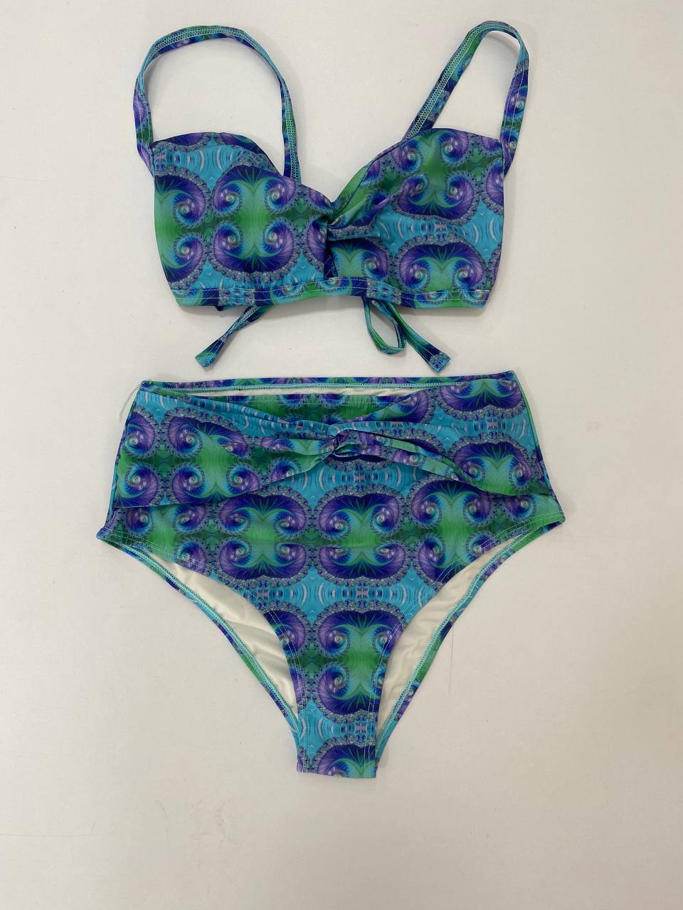 El bikini Olas Esmeralda fusiona frescura y elegancia en un estampado hipnótico de ondas en tonos verdes, azules y violetas, evocando la energía vibrante del mar y la magia de los corales. Su top con moño frontal añade un detalle coqueto y femenino, mientras que la silueta de tiro alto estiliza y aporta comodidad. Confeccionado en licra de alto rendimiento, es el balance perfecto entre estilo retro y sofisticación moderna para brillar en la playa o la piscina.