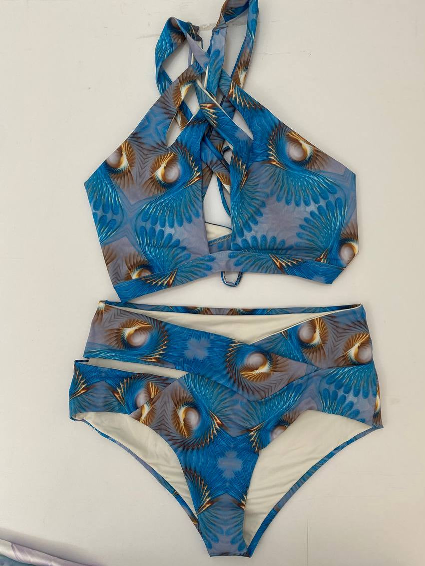 El vestido de baño Plumas Reales resalta con un estampado inspirado en la majestuosidad de las plumas de pavo real, combinando tonos azules y dorados que transmiten elegancia y fuerza. Su top de corte asimétrico aporta un aire moderno y sofisticado, mientras que la parte inferior con tiras entrecruzadas estiliza la figura con un toque sensual y vanguardista. Confeccionado en licra maratón de alta calidad, es la elección ideal para quienes desean brillar con un look único y deslumbrante en cada ocasión.