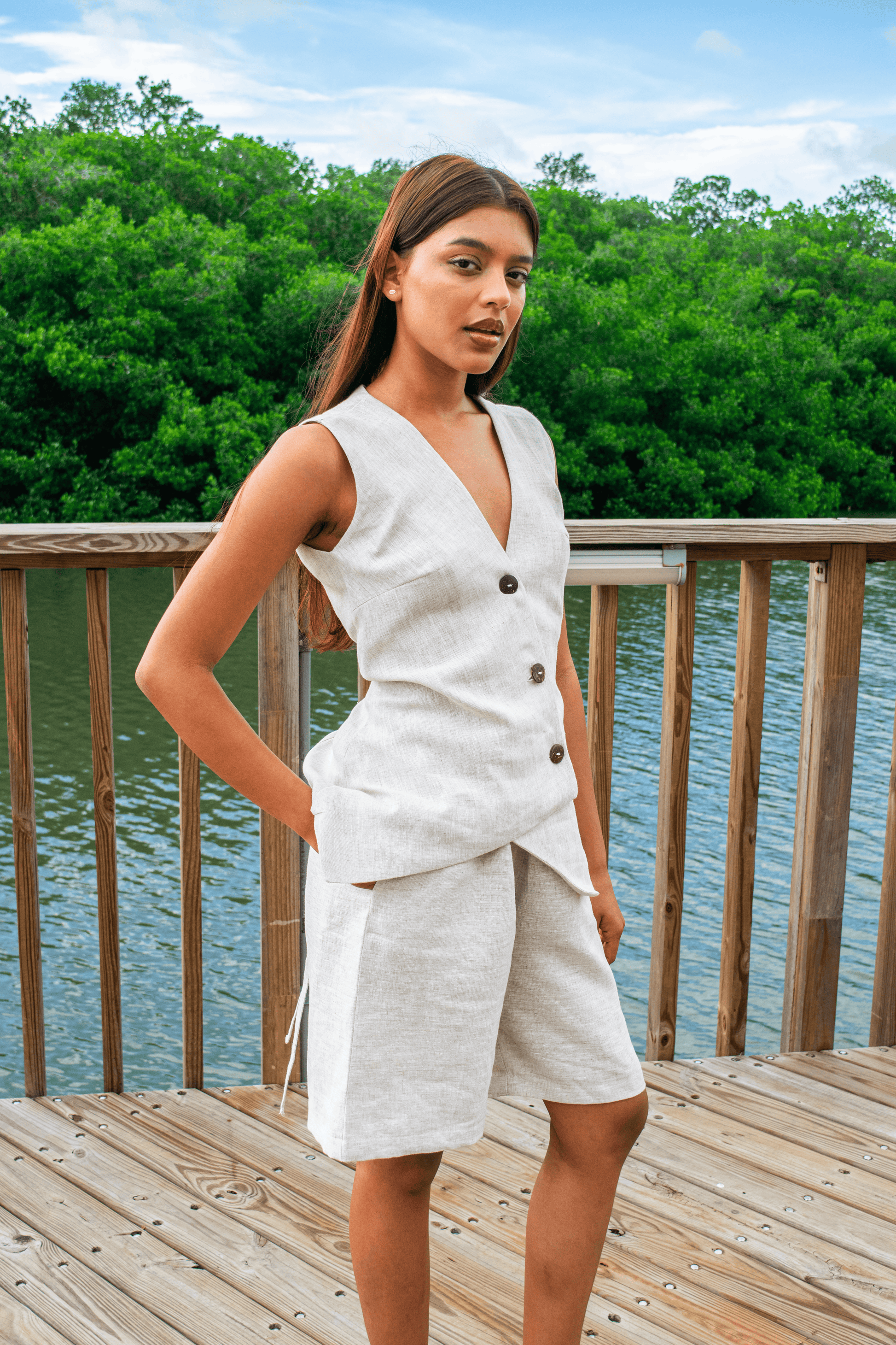 Chaleco elegante y versátil, con un sofisticado escote enV y botones frontales en tono natural que le confieren un aire distintivo. Lo más especial es su diseño con lazos ajustables en la espalda, que permiten ceñir la silueta y añadir un toque femenino y moderno
