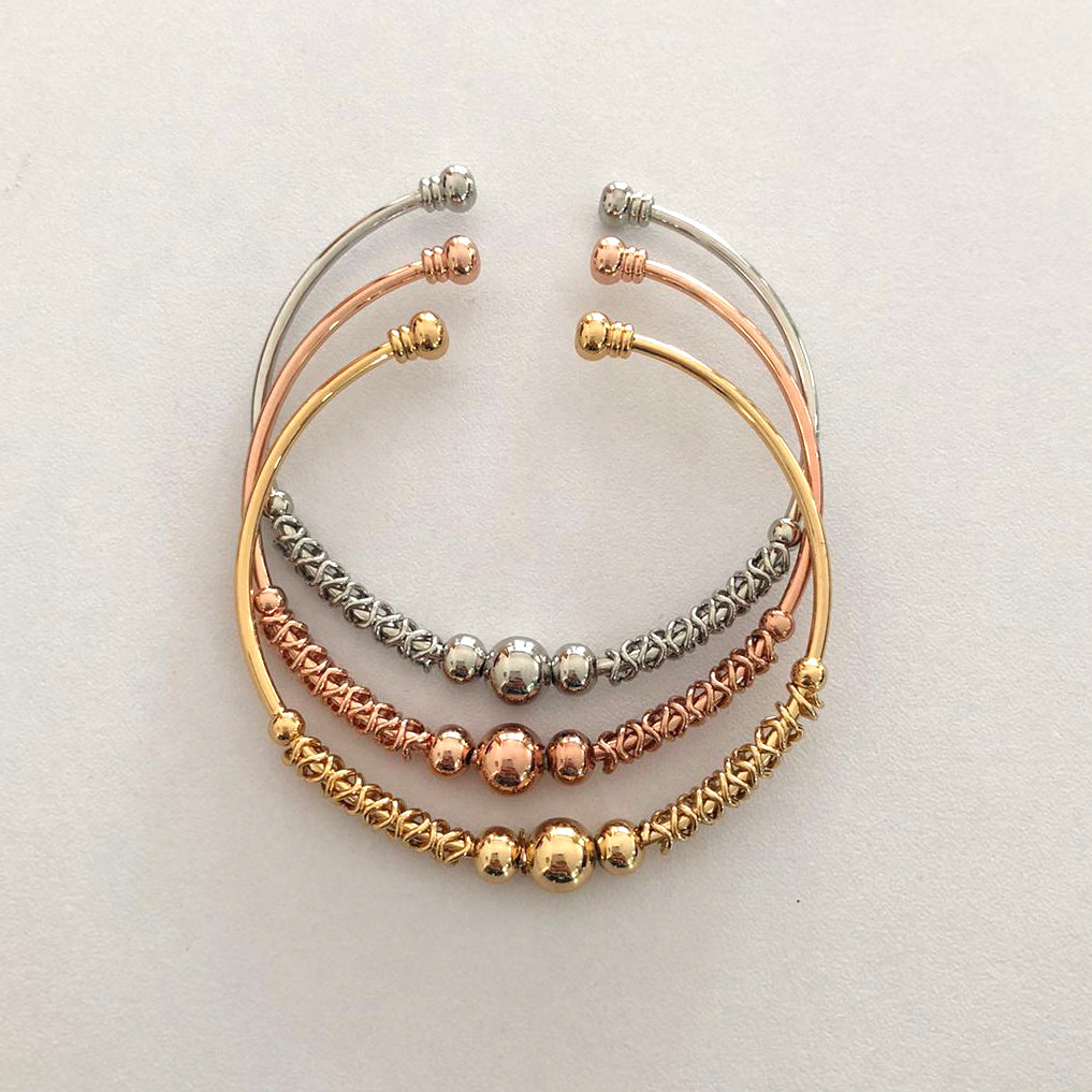 Elegante set de tres brazaletes abiertos en tonos dorado, plateado y oro rosa, cada uno decorado con delicadas cuentas lisas y texturizadas que aportan un toque distintivo y sofisticado. Su diseño ajustable y ligero los hace cómodos para usar durante todo el día, ya sea combinados para un look llamativo o por separado para un estilo más sutil. Perfectos para complementar tanto atuendos casuales como formales.