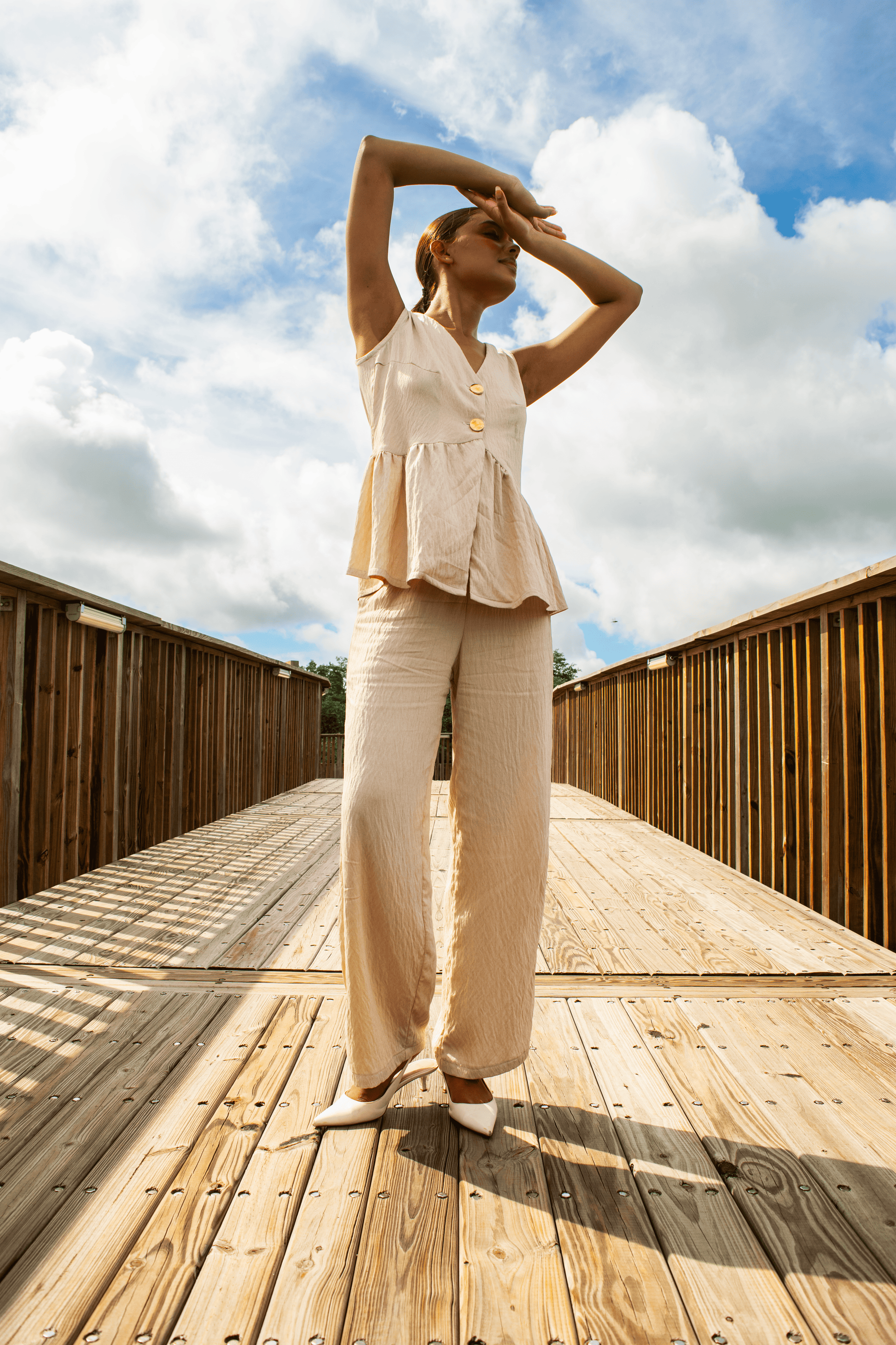 Tiro alto y corte recto o semi-wide leg, mantiene la misma textura, lo que unifica el look y alarga la figura. Su Diseño cómodo permite un estilismo fácil, ideal para combinar con zapatos planos durante el día o tacones para una ocasión más formal