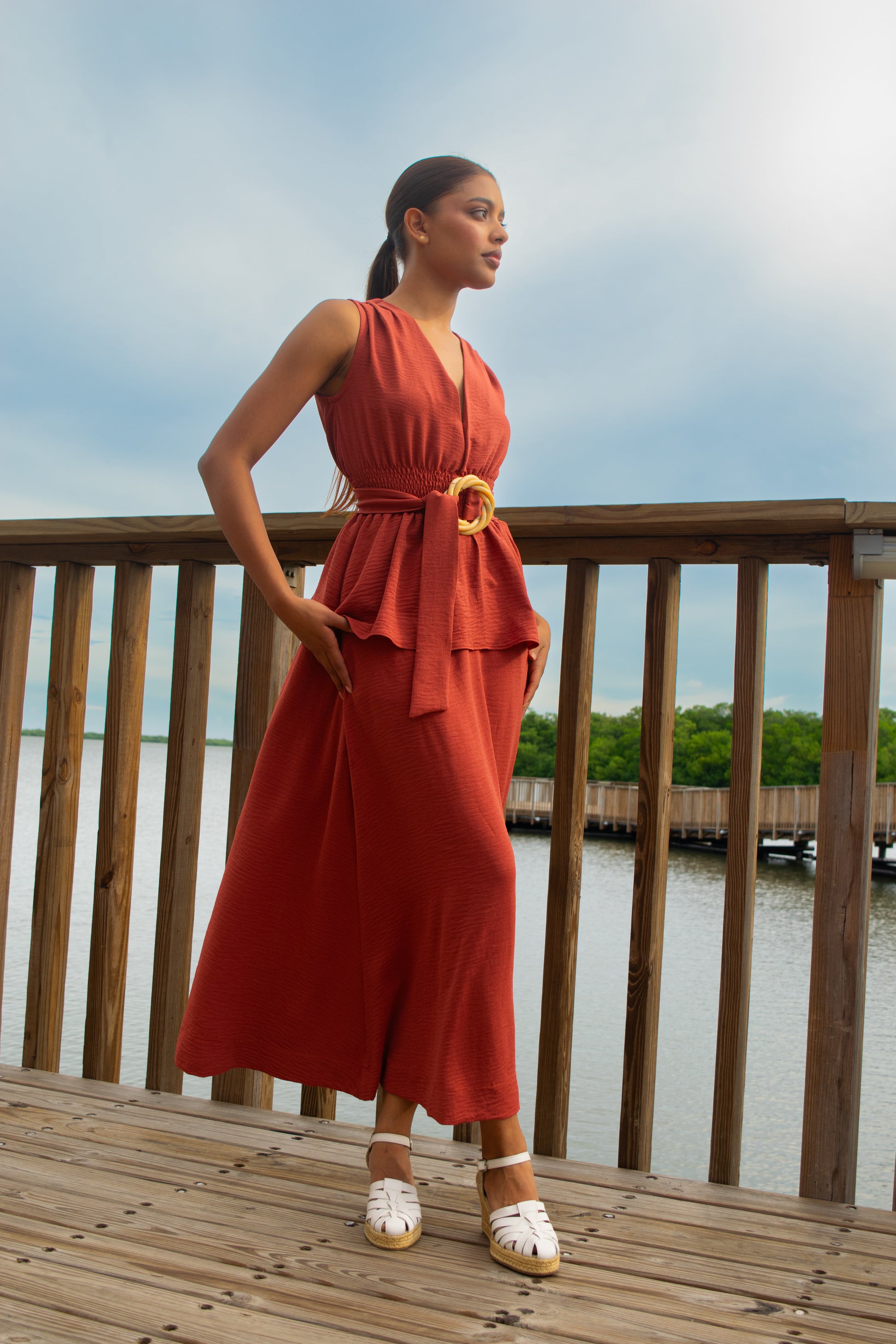 Rinde homenaje a la fuerza y el color distintivo de la flora que sustenta la Ciénaga de Mallorquín. Confeccionado en algodón con una sutil textura, este conjunto en un vibrante tono terracota o rojo óxido es una pieza poderosa y femenina.