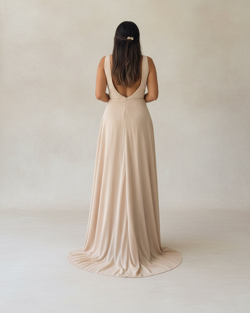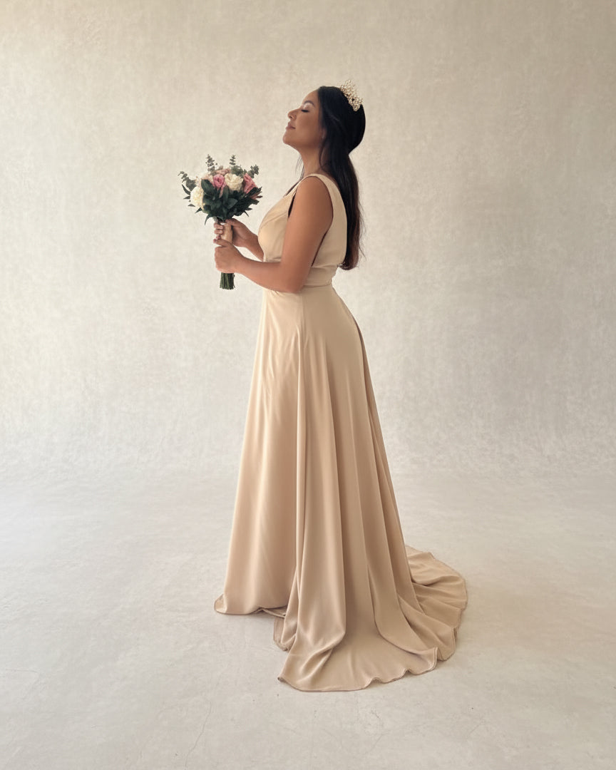 Confeccionado en un tejido suave y fluido de color nude, este vestido presenta un escote profundo en V, espalda igualmente pronunciada y una sensual abertura lateral que añade un toque de audacia a su silueta refinada. Su caída impecable y su estilo limpio lo hacen ideal para una novia contemporánea que quiere destacar con gracia, sin renunciar a la sofisticación. Perfecto para bodas en salones clásicos, jardines modernos o ceremonias al atardecer.