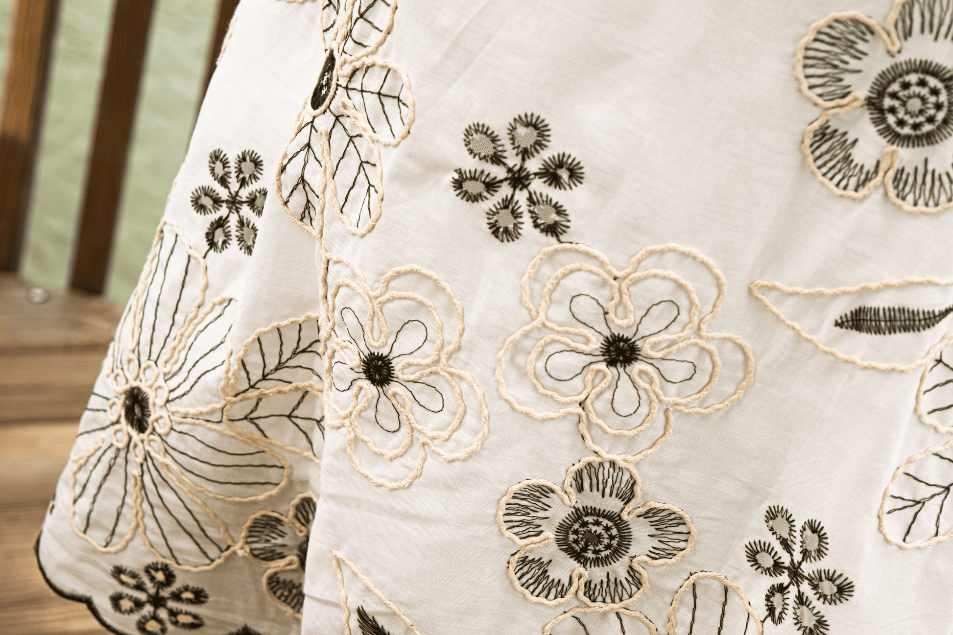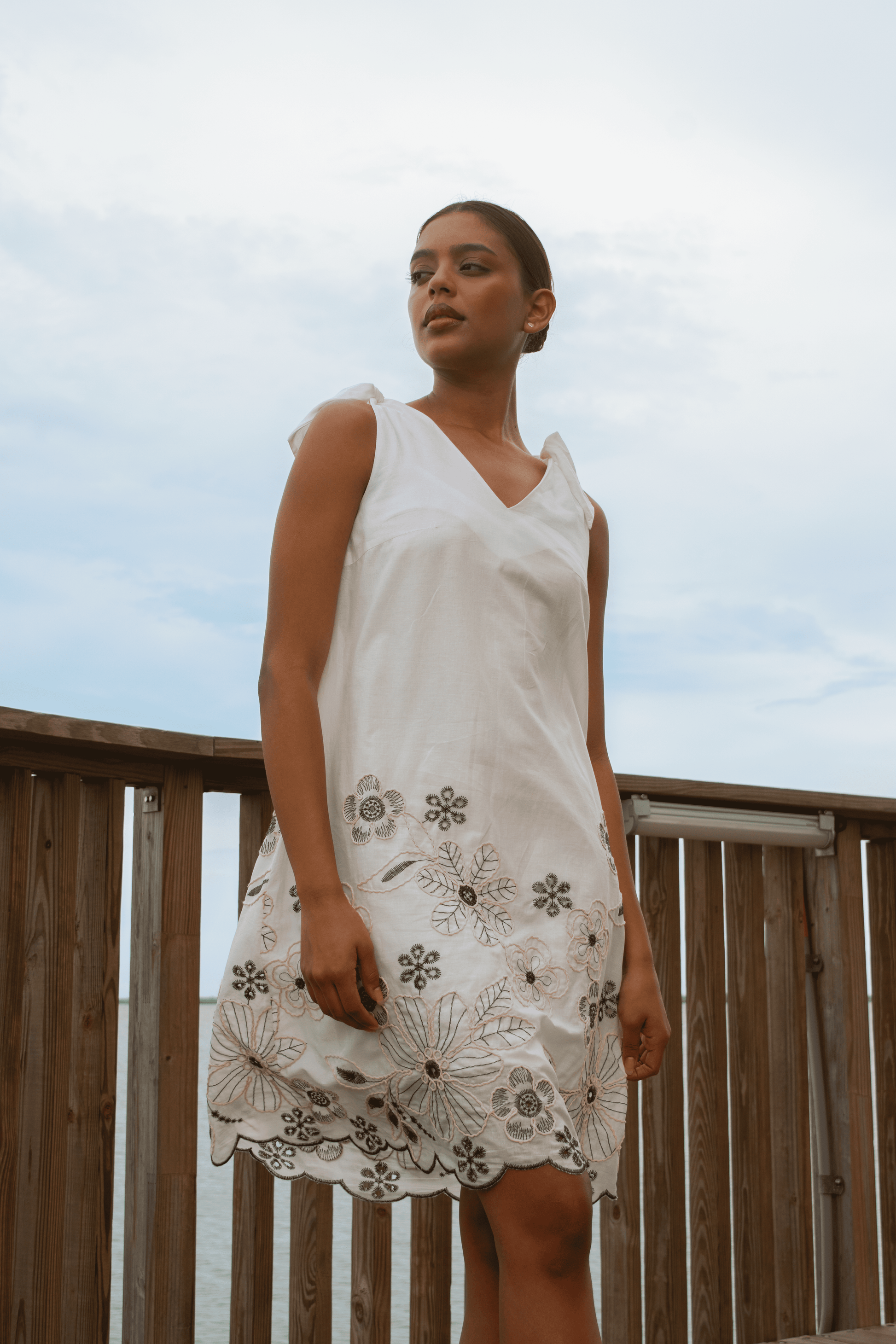 El detalle del bordado, mezclado con la textura sutil del ojalillo, crea una prenda